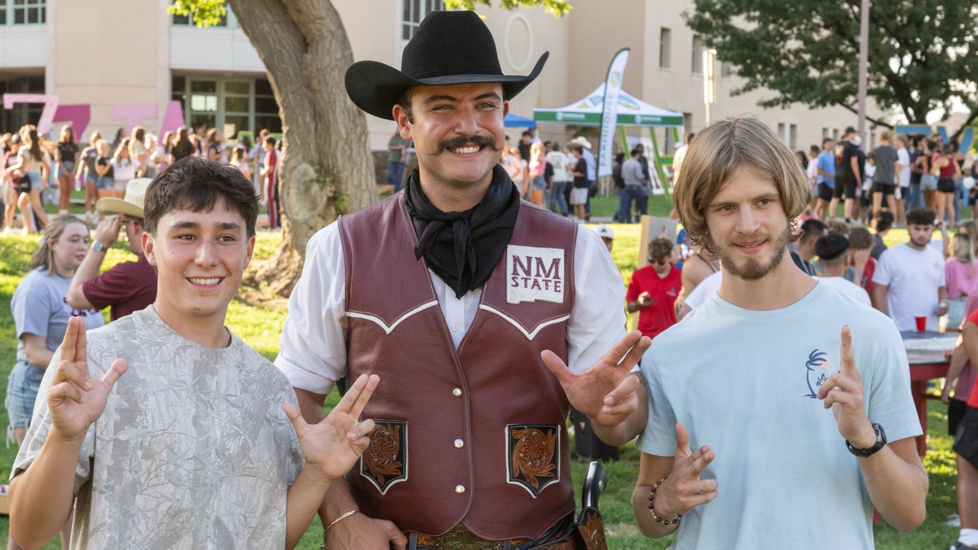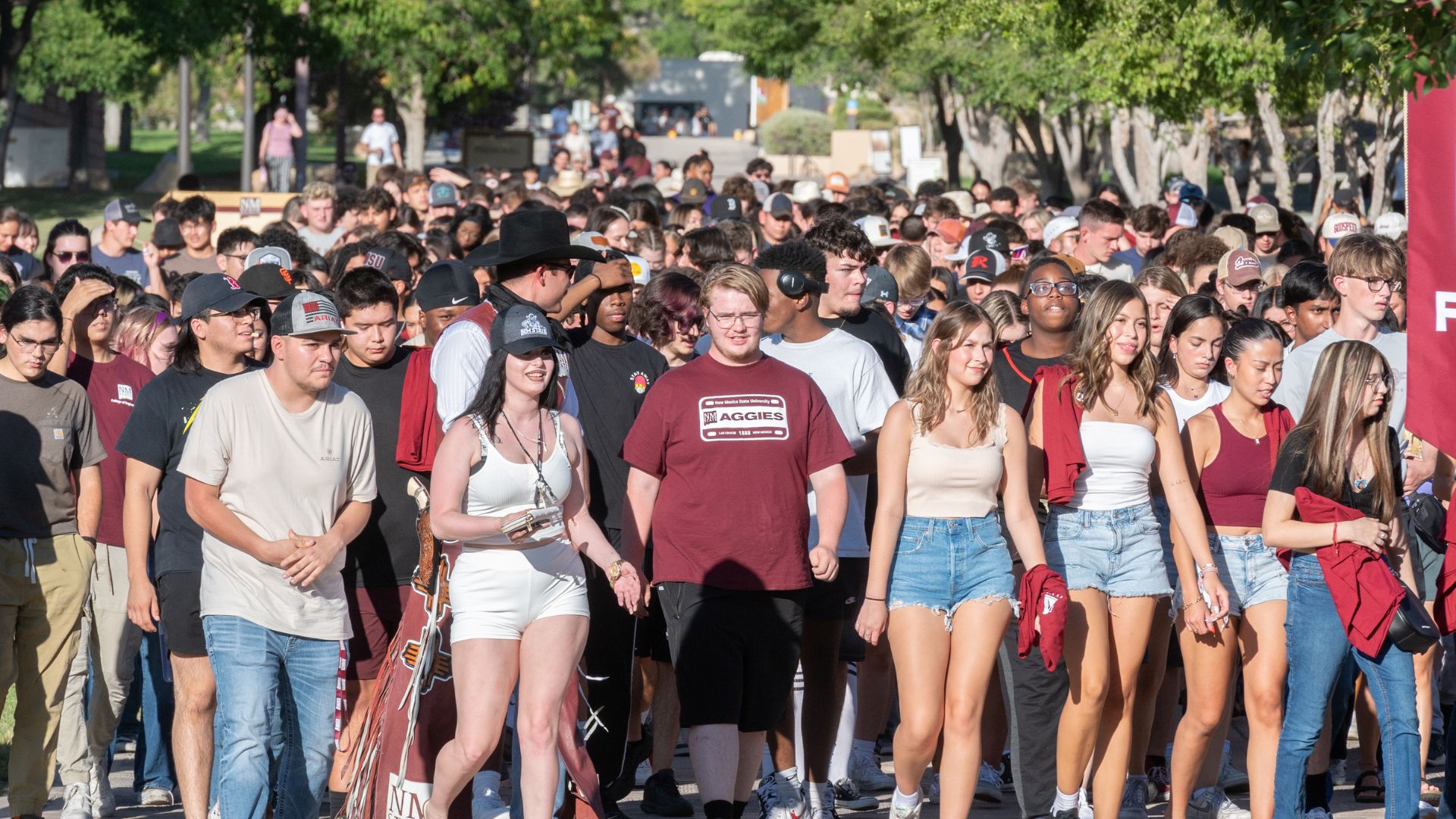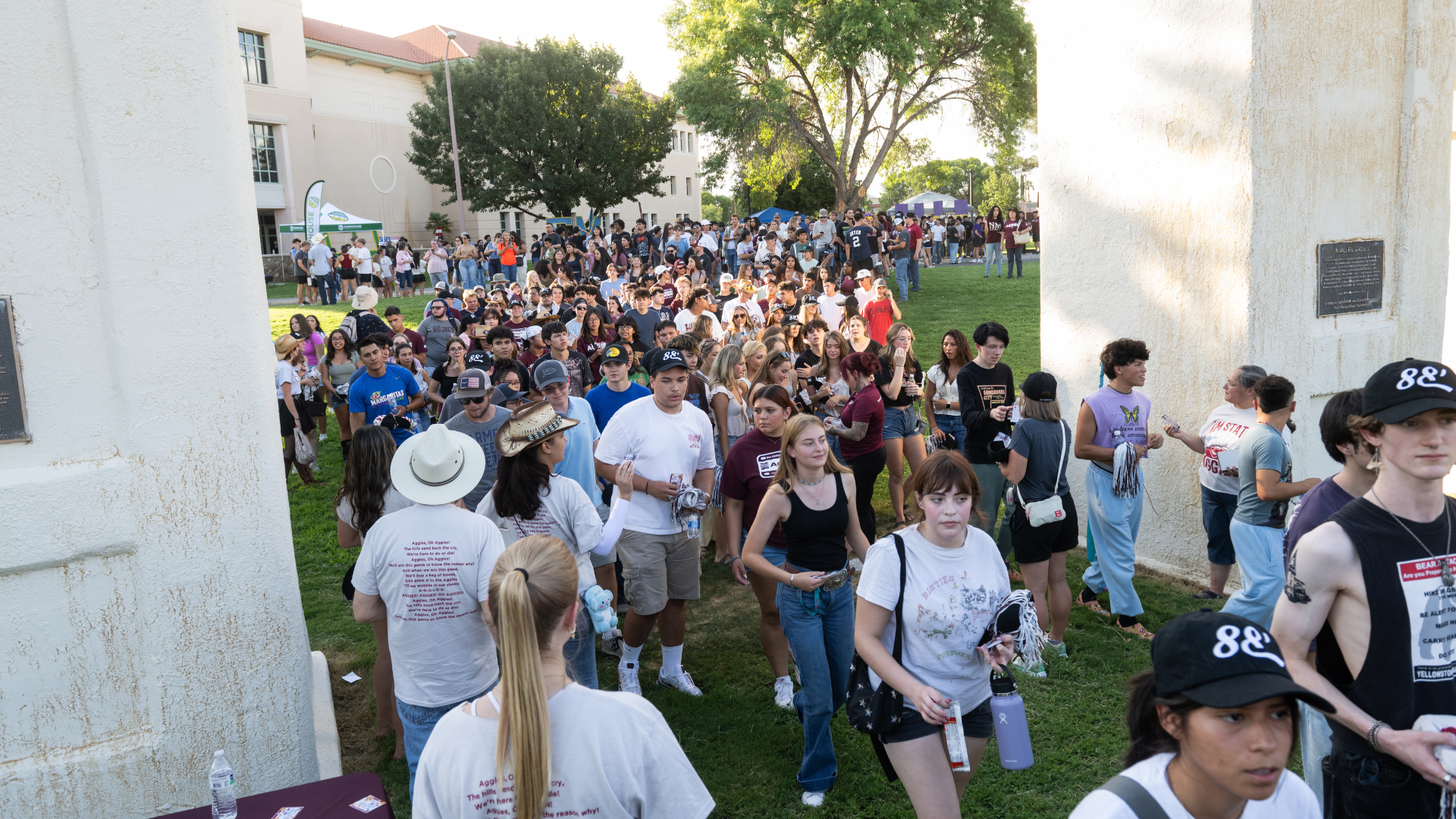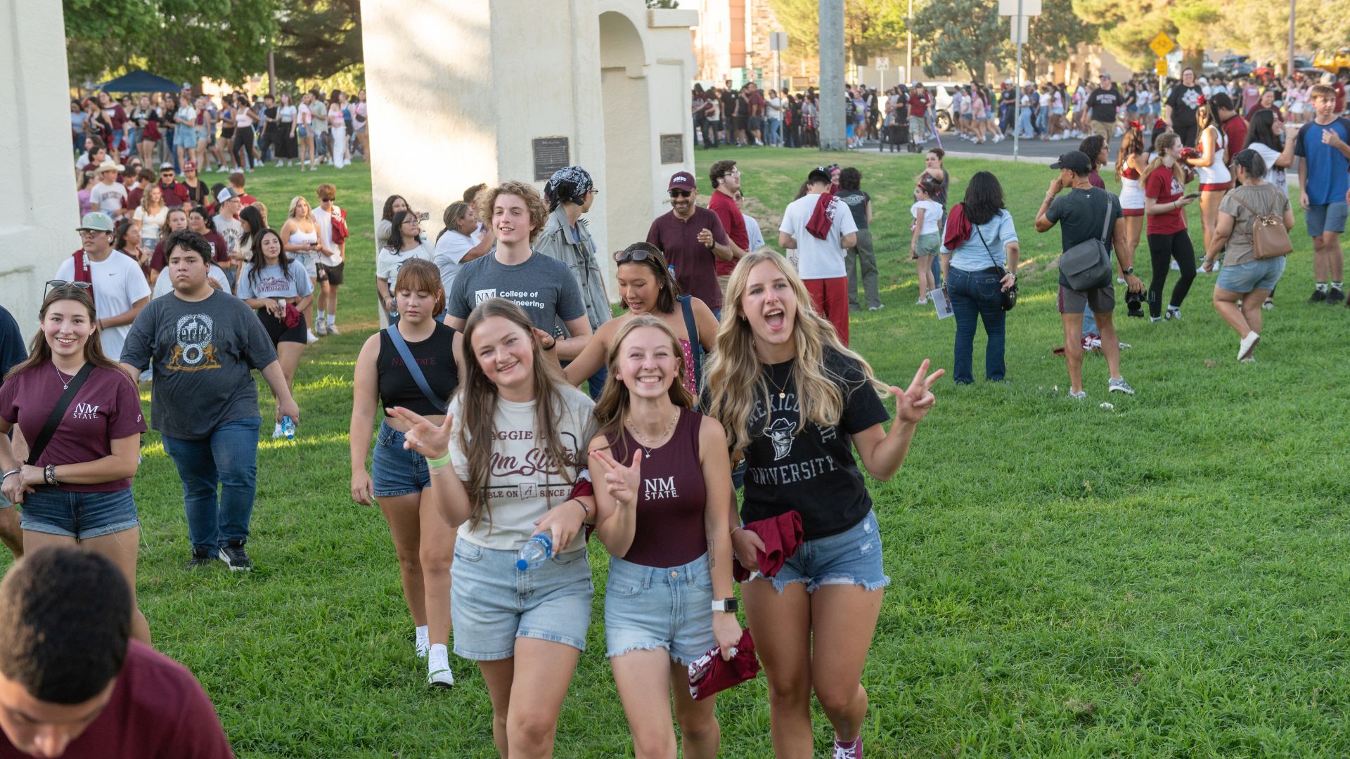 During the opening week of the fall semester, first year Aggies are invited to attend the First Year Walk. Starting at the Pan American Center, students walk through Miller Gate and end up at the location of McFee Hall. Students are met there by the NMSU President and welcomed to the Aggie family.