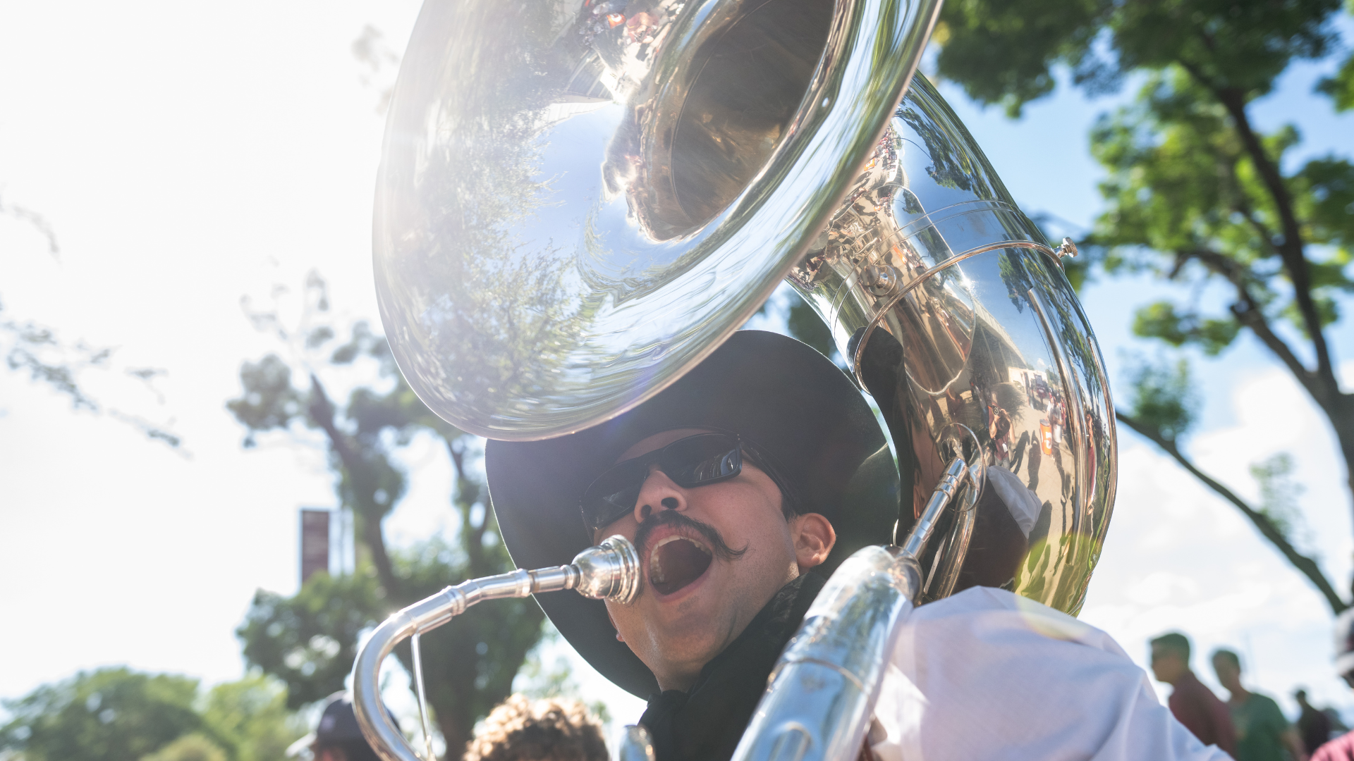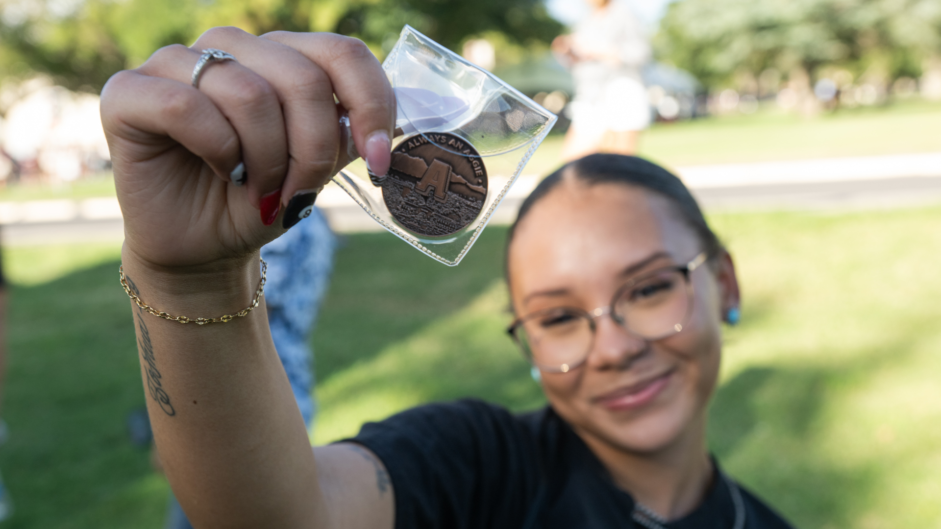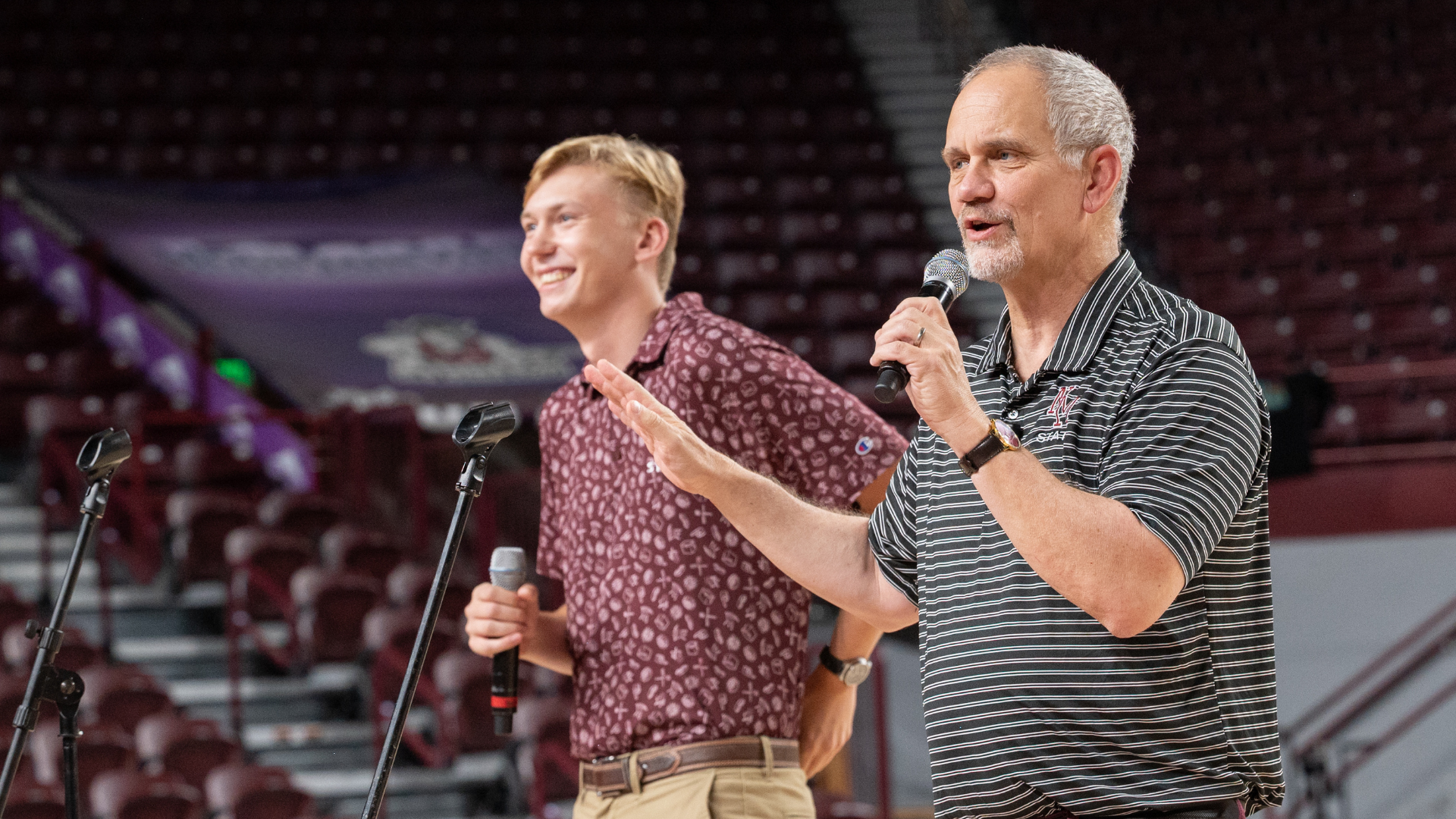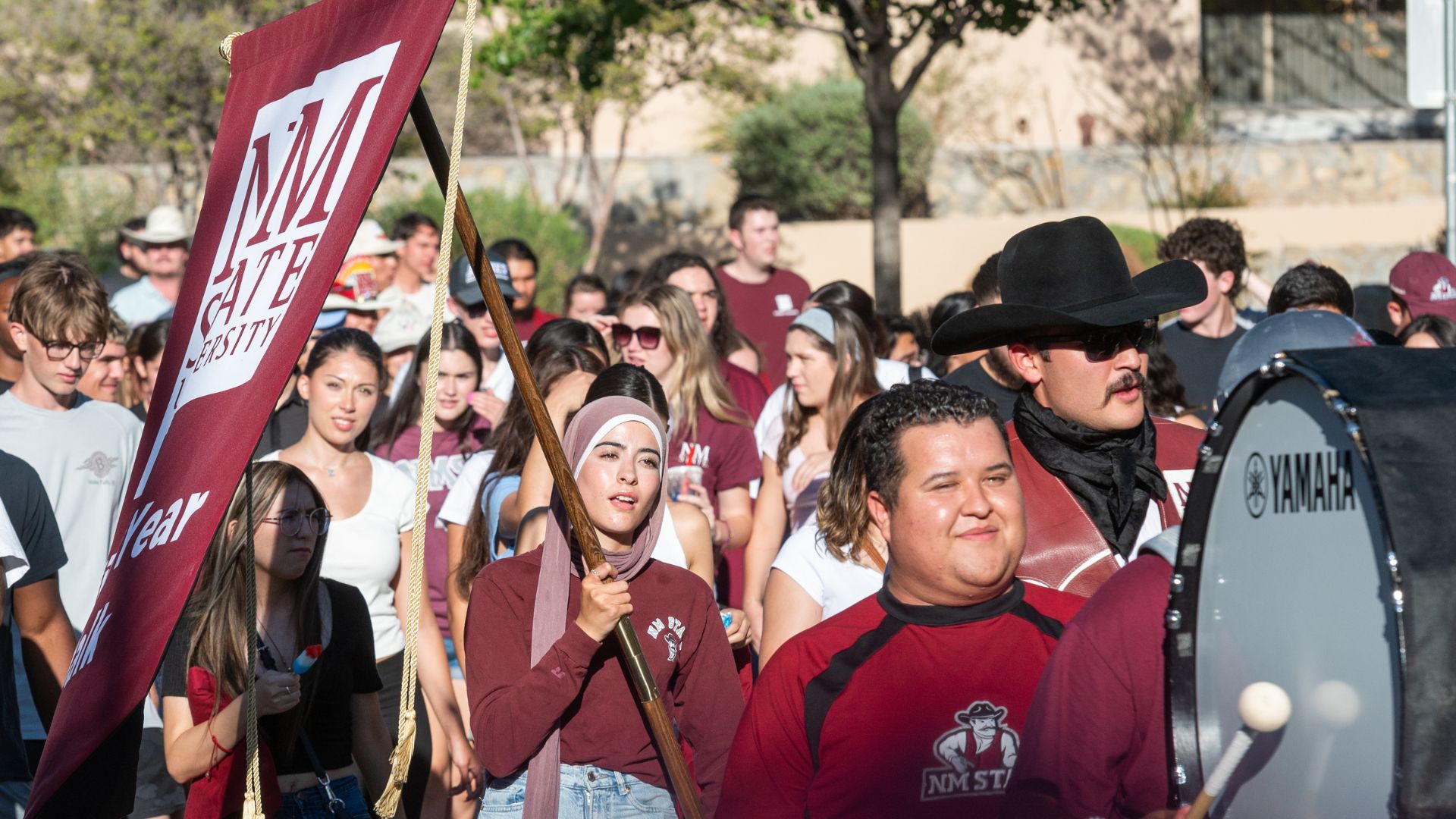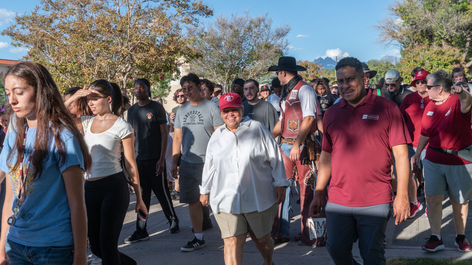 During the opening week of the fall semester, first year Aggies are invited to attend the First Year Walk. Starting at the Pan American Center, students walk through Miller Gate and end up at the location of McFee Hall. Students are met there by the NMSU President and welcomed to the Aggie family.